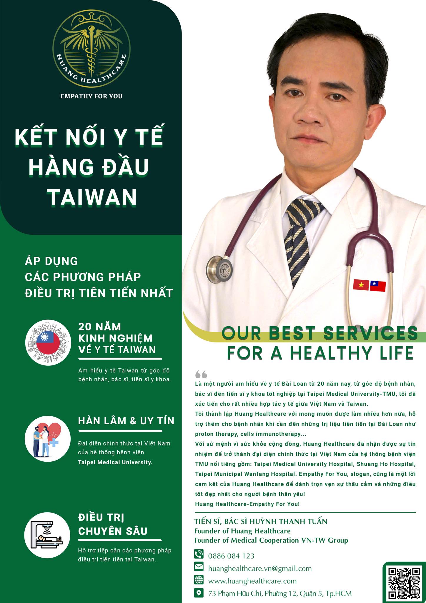 Có thể nói Bs Tuấn là người hiểu rất rõ về Đài Loan từ đào tạo y khoa, đến chính sách phi lợi nhuận của bệnh viện để đem đến một chi phí hợp lý cho người bệnh bản xứ hay cả bệnh nhân quốc tế. Bs Tuấn là người am hiểu tường tận về bối cảnh y tế Đài Loan và cả Việt Nam nên có lẻ Huang Healthcare sẽ là nơi biết rõ để tư vấn cho tình trạng người bệnh, rằng có nên đi Đài Loan hay chỉ cần điều trị tại Việt Nam. Y tế Đài Loan có thể giúp ích được gì cho người bệnh.